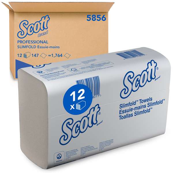 Essuie-mains Scott® SLIMFOLD - M Pliés / Blanc F1Scott® Slimfold 5856 - 12 x paquets de 147 essuie-mains compacts (1764 au total)Remplace la référence fournisseur 585601